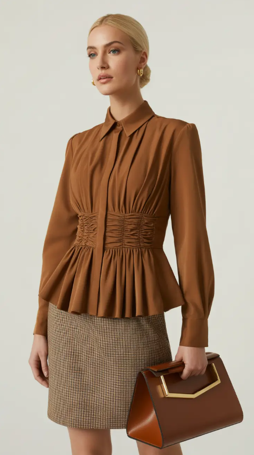 The last look channels warmth, grace and Timeless simplicity. A cinched brown blouse and textured mini skirt combination is elegant and approachable. It’s that perfect Soft autumn outfit to go from meetings to drinks in the evening.