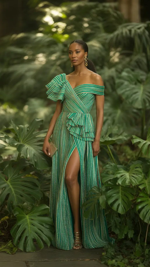 When I first came across this piece it immediately whispered sophistication. The emerald green of the gown paired with soft metallic lines is the heart of Capsule Wardrobe Outfits 2026 – opulence with intention. Its off-shoulder cut and cascading ruffles add structure and fluidity while the slit at the front adds the right amount of allure. It’s that perfect combination of romantic Summer wind and evenings in Glamour that still feels amazingly Timeless.