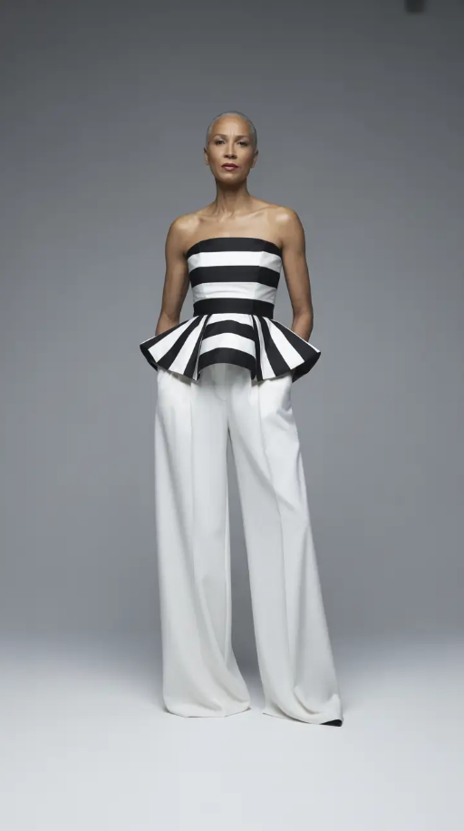 Few things put a smile on my face like a perfect black and white pairing. This strapless peplum top with its dramatic shape with wide white trousers, epitomizes the art of Minimalist power dressing for those Women who desire balance and precision. The series of bold stripes has a graphic yet harmonious feel, which gives a harmonic feel you can’t forget about this outfit.