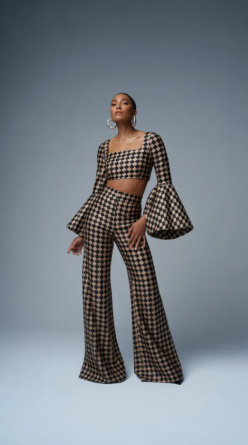 This patterned co-ord set takes capsule dressing to statement territory. A bold checkered crop top and wide leg pants with bell sleeves prove that Minimalist doesn’t mean colorless – it means focused. The shape is clean, the palette sophisticated and yet the effect is sexy. There’s balance to the symmetry, freedom to the flow.