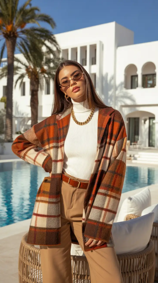 This Last Look is like Travel and Autumn dreams rolled in one. The warm plaid cardigan worn in combination with camel trousers and a crisp white turtleneck makes it both nostalgic and freshly modern. It’s clean, grounded, and deeply Minimalist; just the roots of what Capsule Wardrobe Outfits 2026 are based upon.