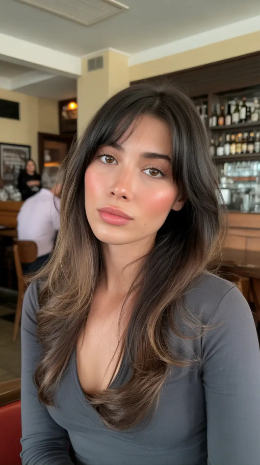 12. Deep Brunette with Cinnamon-Satin Flicks and Curtain Bangs