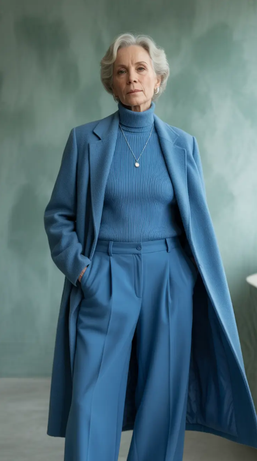 Full blue outfit such as this one is relaxing and dramatic. The custom-made trousers, the ribbed sweater, the long coat over them is a masterpiece in toning on toning dressing amongst grown-up ladies who adore refined minimalism. The monochrome dresses remain in women fashion until 2025-2026, and this blue shade of icy blue suits the winter season.