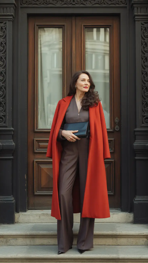 Bringing winter glamour on board. An over coat of red, hanging down over fashioned brown trousers and an inner blouse, of deep tint–easy refinement, very modern. Red has never been a cooler color and in winter clothes over 60 2025-2026, it comes back strong.