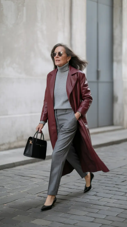 The combination of a burgundy trench coat and the light gray hues reminds Paris at the end of November. It is sophisticated, age-old and suitable to older women who prefer old fashion and yet not the same old stuff. The long coat is flowing beautifully and the slim cut trousers and turtleneck provide silent structure. This appearance is a perfect mix of errands to a concert or an afternoon coffee in NYC.