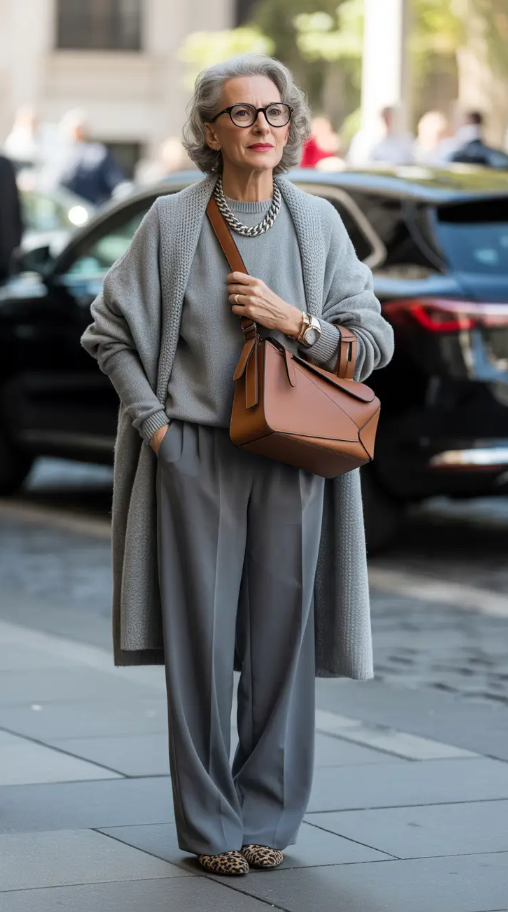 Soft gray fabric, easy tailoring, and a structured brown leather bag – this clothes are what can be called a classy simplicity. It is refined, smooth, and softly uplifted, an ideal choice of older women who like sleek comfort during unpredictable weather conditions. The wide trousers and long cardigan allows one to move freely and the appearance keeps the look classy.