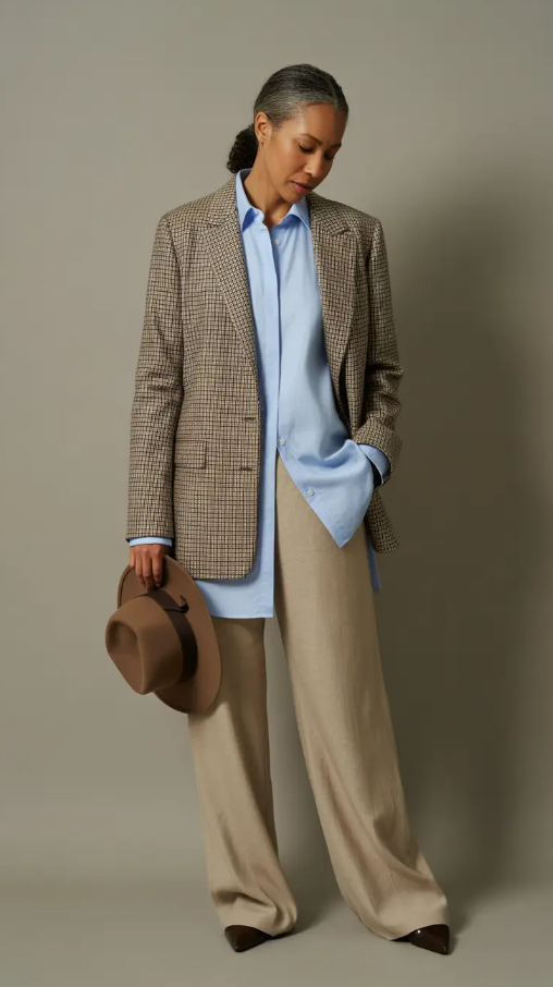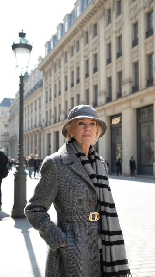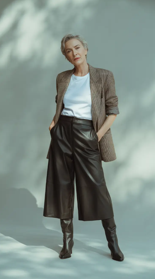 I love this mixture because of the audacious and refined approach. The combination of a checkered blazer, a plain white tee, and leather culottes brings about the type of the appearance that is both sophisticated and daring at the same time. To older women winter style, it is a balance between a classy construction and a modern style, which is precisely what makes winter outfits over 60 2025-2026 seem to be new again.