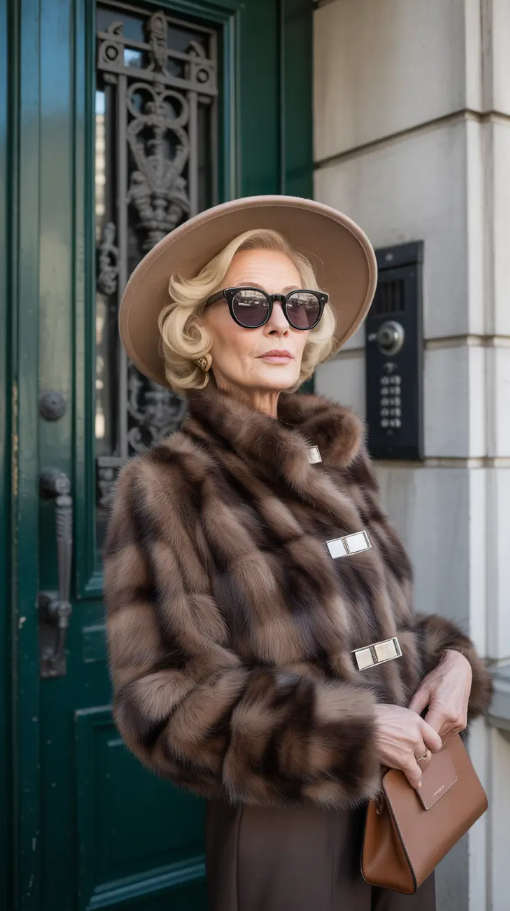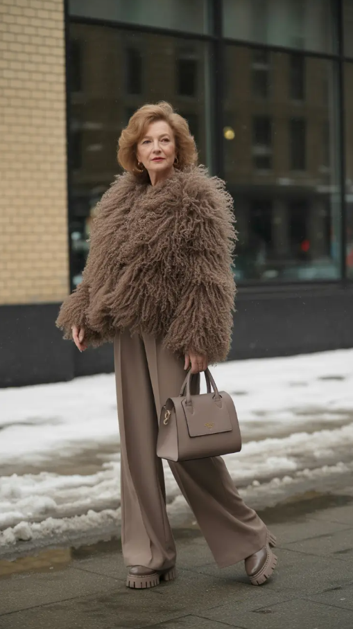 Something simply sophisticated with rich brown in winter. This is the spirit of this appearance: a luxurious counterfeit fur coat in deep mocha, designed with custom-cut brown pants, a tailored beige hat, and heavy sunglasses. The conglomeration is like a love poem to old European style- older women on their best. It is the type of clothing that exudes certainty during any season and temperature, be it cold New York mornings or night parties.