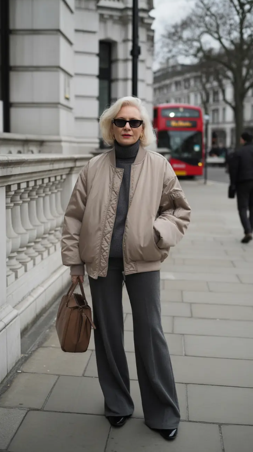 This final glance is evidence that older women are capable of doing chic, womens casual fashion with an element of modernity. There was a taupe bomber jacket over a charcoal turtleneck and tailored trousers, comfortable, sharp and slightly boho in spirit. It is that old and at the same time street-style comfort that makes it the best on the NYC streets or Florida vacations when the temperatures are warm but do not get too hot.