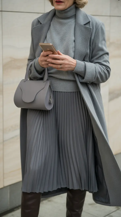 A midi pleated dress in combination with a sweater and coat – this is a model of the fashion of refined women. It is a quick and simple style of keeping warm and staying fashionable and the gray color scheme is monochromatic, making it classy without trying. The bag itself is organized with the bagtie that is a silent sophistication that is ideal with older women who appreciate understated sophistication.