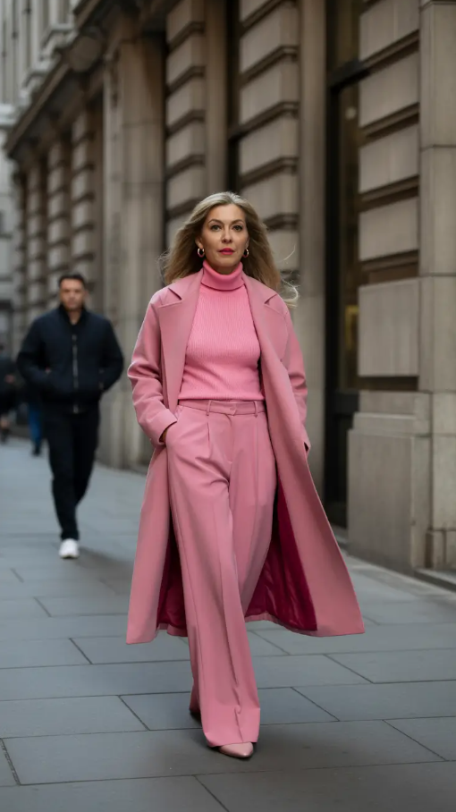 Who knows, pink can be used in spring. This head to toe blush and fuchsia outfit demonstrates that winter looks of older women can be happy and strong simultaneously. The customized coat, broad trousers, and ribbed turtleneck are the elements that add the drama in the most desirable manner.