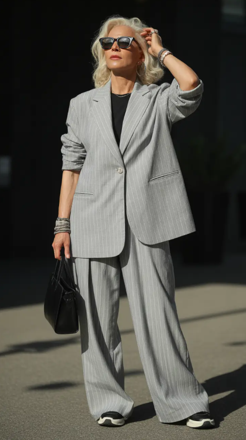 There is not much like a perfectly fitted pinstripe suit to attract attention. That classic tailoring that is relaxed and women fashion is captured in this look. The blazer is oversized and the trousers are wide, which makes the vibe casual but elegant, and sneakers provide it with a playful touch that will keep it fresh in 2025.