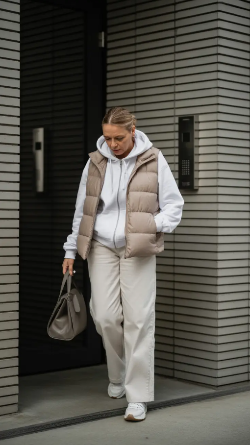 Comfy, cozy, and beyond comfortable, this outfit is an evidence that older women can be stylish sporty and neutral. The white hoodie and wide-leg trousers with the beige puffer over it are ideal in the mild degree, or lazy weekends. It looks simple with white sneakers and a taupe bag, though so convenient.