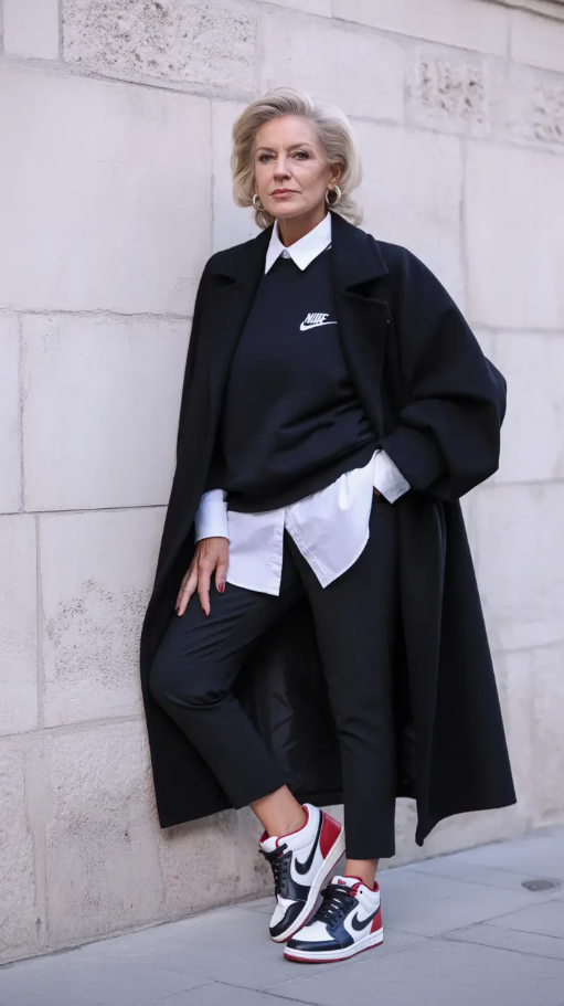 Who knows that sporty is not classy? This appearance reinvents casual dress clothes among the older women and a black coat is worn with a sharp white shirt beneath a Nike sweatshirt. It is urban, contemporary, and absolutely cool enough to run errands, travel or even attend open air concert when it becomes chilly.