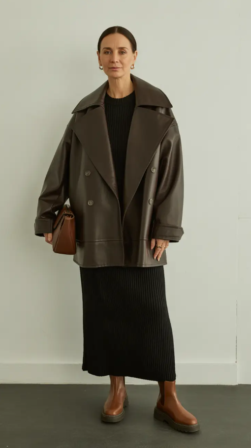 Something magnetic about the all-leather look is that it is not straining too hard. This garment transports the fashion of women into a place where old-fashioned women dress casually can easily pass off as modern. The oversized sleeves of the jacket made out of cropped leather combined with wide-leg trousers immediately determine the shape without screaming at viewers. I am fond of the way this style is both strong and subtle at the same time, it is elegant, somewhat enigmatic, and just stylish enough in terms of being worn in colder degrees.