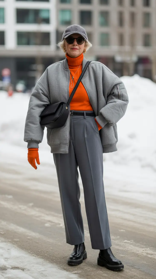 Nothing like a shot of color to liven a grey winter day. This is a contemporary and vibrant appearance, a piece in women fashion that is not overly warm or streetwise. Assortments of the orange turtleneck and glove sets in the gray bomber jacket make old women winter wardrobes uncritically lively, and tailored pants and blocky boots make them urban practical.