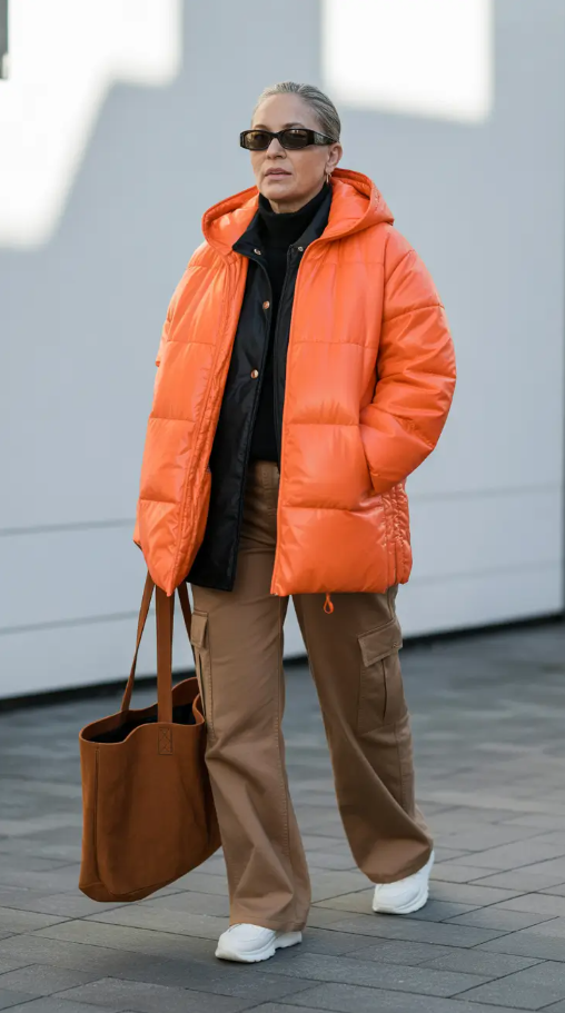 It is an orange puffer of bursting sunshine in the cold. It is uninhibited, functional, and unexpectedly fashionable. Combined with a pair of neutral trousers and white sneakers, the balance is cute but adult-like, an outfit that will make you think you are ready to drop your degree without losing any style.