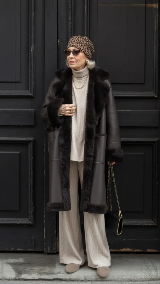 This appearance reminds of the old-fashion beauty in the most comfortable manner. The fur-lined coat worn over a cream ribbed knit set is luxurious but down to earth the type of winter clothes above 60 2025-2026 piece that puts you in an unstoppable mood. This leopard beret is the finishing touch, which reiterates the boho flair in a well-bred style.